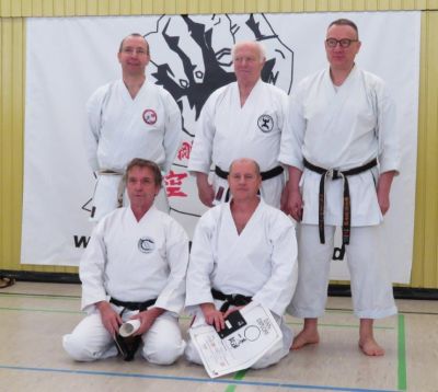 Unser Vorstand Roland Spohn hatte sich vor Monaten ein neues Ziel gesetzt: das Erklimmen der nächsten Stufe in der Meister-Rangordnung. Gemeinsam mit unserem langjährigen Gastschüler Peter Krüger aus Vaihingen Enz bereitete sich Roland intensiv für diese Prüfung vor. Beide hatten Hochs und Tiefs durchlebt, um sich dann am 19.11.2017 unter den kritischen Augen des hochrangigen Prüferteams den Herausforderungen der Danprüfung zu stellen. Das Prüfungskomitee setzte sich zusammen aus Fritz Nöpel, 10.Dan, Prof. Dr. Franz Diemand, 7.Dan und Wilson Sturm, 5.Dan. Schon samstags reisten Roland und Peter nach Berlin, nahmen an einem Lehrgang teil und sonntags morgens um 9 Uhr begann endlich die Prüfung. Zunächst wurde die Grundschule überprüft, gefolgt von der Kata (Formenlauf) und deren Analyse. Danach standen die Partnerübungen und Würfe auf dem Prüfungsprogramm. Und zum guten Schluss mussten beide zeigen, was sie in der waffenlosen Selbstverteidigung präsentieren können. Nach einer Pause, die die Prüfer zur Auswertung der Prüfung nutzten, nahmen danach alle Prüflinge wieder die Aufstellung ein, um das Ergebnis in Empfang zu nehmen. Unser Roland Spohn bestand seine Prüfung zum 5. Dan. Ebenfalls legte auch unser Gastschüler Peter Krüger erfolgreich die Prüfung zum 5.Dan. ab. Wir, die Karatekas aus Hardthausen, gratulieren recht herzlich zur bestandenen Prüfung. Beide Danträger sind der Beweis, dass man auch im fortgeschrittenen Alter unter guter Anleitung eine tolle Leistung abrufen kann. |