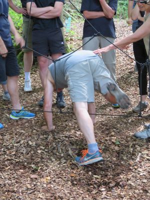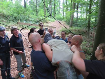 Im Zuge unsers diesjährigen Jubiläumsjahres sind wir am 07.07.18 nach Langenburg in den Klettergarten gefahren. 14 Mitglieder unserer Abteilung haben sich am Samstag, den 07.07.18 am Bürgerhaus getroffen. Michael Matthes hat freundlicherweise einen kleinen Bus organisiert. Mit diesem Bus und dem Privat Pkw von Thorsten sind wir um 11.00 Uhr in Richtung Langenburg gestartet. Mit dem Team vom Klettergarten waren wir um 14.00 Uhr verabredet. Wir hatten damit in Langenburg noch genügend Zeit, die erste Vesperpause einzulegen und uns in Langenburg umzusehen. Um 14.00 Uhr ging es dann los. Wir haben uns mit dem Team des Kletterparks getroffen. Wir wussten, dass der Kletterpark wegen Revisionsarbeiten, geschlossen war und waren auf das Alternativprogramm gespannt. Und dieses Alternativprogramm hatte es in sich. Auf uns warteten Aufgaben, die wir nur als Team lösen konnten. Dies bedeutet, wir mussten für die Aufgaben gemeinsam Lösungen suchen und diese Lösungen dann auch alle umsetzen. Wenn einer gepatzt hat, bedeutete das "zurück auf Anfang" für alle. 2 Beispiele:Seilspringen: Ein Seil wurde von dem Team des Kletterparks geschwungen und alle mussten, ohne das Seil zu berühren, durchspringen. Das Schwierige daran: Es musste sich immer eine Person innerhalb des schwingenden Seiles befinden. Das Gitternetz: Zwischen 2 Bäumen war eine Netz gespannt, das unterschiedlich große Öffnungen hatte. Alle Mitglieder mussten durch das Netz und das Netz durfte nicht berührt werden. Nur einige der Öffnungen durften von 2 Personen genutzt werden, ansonsten durfte eine Öffnung nur einmal genutzt werden. Hier war Teamarbeit gefragt. Die Zeit verging (zu) schnell und wir mussten weiter nach Crailsheim zur Besichtigung der Brauerei Engel. Die Führung dort war sehr interessant. Noch besser aber war die anschließende Bierverkostung in einem Lokal. Unsere Vereinskameradin Eva , die es beruflich nach Crailsheim gezogen hat, hat uns dann noch zum Abschluss zu sich nach Hause eingeladen. Es war ein sehr schöner und interessanter Tag. |