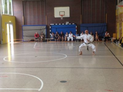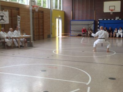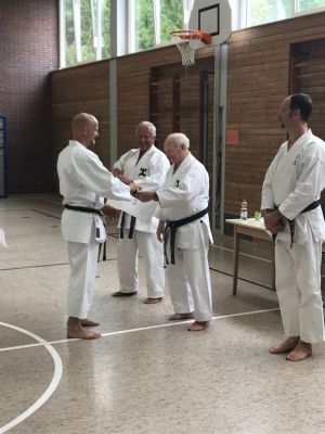 Am 21.07.18 legte Thorsten erfolgreich die Prüfung zum 4. Dan im Goju-Ryu Karate in Erlangen bei Nürnberg ab. Als Thorsten und sein Trainingspartner Bernd Stephan in Erlangen ankamen,mussten sie zu ihrer Überraschung feststellen,dass es sich nahezu um eine "Unterländer" Prüfung handelte Von den 6 Karatekas, die sich zur Dan-Prüfung stellten, kamen 2 aus Neckarsulm, 2 aus Bad Friedrichshall und Thorsten aus Hardthausen. Der 6. Karateka kam aus Oberriexingen.Mit dem Dojo aus Oberriexingen sind wir aus Hardthausen sehr gut bekannt. Die Prüfungskommission bestand aus dem Vorsitzenden Fritz Nöpel - 10. Dan -, Alexander Jährig - 5. Dan-, und Franz Katzelberger aus Österreich - 6. Dan -. 4 Karatekas traten zur Prüfung zum 1. Dan an, ein Karateka zur Prüfung zum 2. Dan und Thorsten zur Prüfung zum 4. Dan. Die Prüfung begann um 16.00 Uhr. Thorsten überzeugte mit einer sehr guten Vorführung der Kata Sepai sowie kraftvollen und präzisen Grundschultechniken. Auch den 2. Teil der Prüfung , bei der die Techniken am Partner gezeigt werden mussten, einschließlich Würfen und Selbstverteidigungstechniken, macht Thorsten sehr gut. Fritz Nöpel bescheinigte Thorsten eine "klasse Prüfung" und sagte ihm, dass er mit Erlangung des 4. Dan Grades den Titel Sensei tragen darf und in Japan jetzt zur Führung eines Dojos berechtigt wäre (in Deutschland sind diese Vorgaben nicht zu streng). Dieses Lob war für Thorsten deshalb etwas Besonderes, weil er 2009 mit einer Gruppe von Karatekas unter Führung von Fritz Nöpel für 14 Tage in Japan war und dort die Möglichkeit hatte, eine knappe Woche in einem japanischen Dojo mit zu trainieren. Die Abteilung Goju-Ryu- Karate Do gratulieren Thorsten ganz herzlich und wir sind uns sicher, dass der Karateweg von Thorsten noch lange nicht zu Ende ist. |