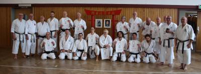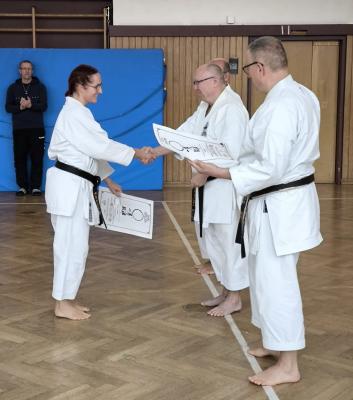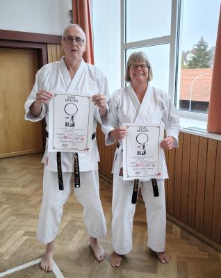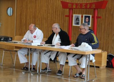 In der kleinen Gemeinde Hardthausen wurde zum Ende des Jahres eine Dan-Prüfung für Goju Ryu Karatekas angeboten. Als Prüfer zugegen waren Goju Kai Urgesteine wie Klaus Fingerle 8.Dan, Prof.Dr. Franz Diemand 8.Dan und Christian Schollenberger 7.Dan. Diesem Angebot zur Prüfung folgten Karatekas aus Neuss, Glücksburg und Großraum Heilbronn / Eppingen. Schwäbisch pünktlich begann die Prüfung um 11 Uhr. Mitgereiste Freunde und Verwandte saßen erwartungsvoll auf der Bühne und bangten, was da kommen möge. Dan-Prüfungen folgen immer dem gleichen Ablauf: Kihon Ido Kata , Kata Bunkai, Yaksoku Kumite – Nage Waza , SV-Arbeit und für junge Prüflinge der sportliche Freikampf. Schon zu Beginn der Prüfung zeigte sich, dass die Prüflinge ausgezeichnet vorbereitet waren. Ihre akribische Vorgehensweise setzte sich wie ein roter Faden in allen Bereichen fort. Bemerkenswert waren die Geburtsjahrgänge der Teilnehmer: die jüngste mit 39 und der älteste mit 77 Jahren. Es bestätigte sich einmal mehr, dass bei regelmäßigem Training und guter Anleitung im Dojo doch noch so manches machbar ist. Für die Prüfer und Zuschauer gab es ein Fest der Kampfkunst Goju Ryu. Technisch saubere, tolle Vorträge gepaart mit Ideenreichtum ließen die Prüfer zufrieden dreinschauen. Mit tiefgreifenden Gedanken und exzellenter Umsetzung wurden die Zuschauer in den Bann gezogen. Eine Stecknadel hätte man fallen hören können. Eine schönere Entlohnung bei der gezeigten Darbietung gibt es wohl kaum. Somit hatten es die Prüfer leicht, die neuen Graduierungen zu bestätigen. Herzlichen Glückwunsch an dieser Stelle an alle Karatekas. Neuer Dan-Grad für: Marcel Herchel 1.Dan ( SV Heilbronn am Leinbach ) Klaus Keicher 1.Dan ( Sagamikan Neckarsulm ) Günter Krenz 1.Dan ( TSV Glücksburg 09 ) Alexander Madiev 1.Dan ( Sagamikan Neckarsulm ) Mohamed Mihoubi 3.Dan ( Frankenbach KD ) Eva Franz 4.Dan ( TSV Hardthausen ) Harry Gilbert 4.Dan ( KC Vaihingen Enz ) Angelika Autenrieth 5.Dan ( Karate Verein Eppingen ) Daniela Fröhlich 5.Dan ( TSV Hardthausen ) Ralf Halter 5.Dan ( Sagamikan Neckarsulm ) Helmut Fischer 7.Dan ( Sagamikan Neckarsulm ) Jochen Xenos 7.Dan ( Gojukan Neuss ) |